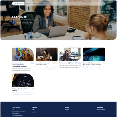 De kleuren van het logo zijn op een rustige en overzichtelijke manier door de hele website verwerkt. Dit zorgt voor een prettige scrollervaring, zonder dat je wordt afgeleid door andere elementen. Een leuke extra is de rubriek S&Z Actueel, waarin artikelen over de uitzendbranche en werkgerelateerde onderwerpen te vinden zijn.