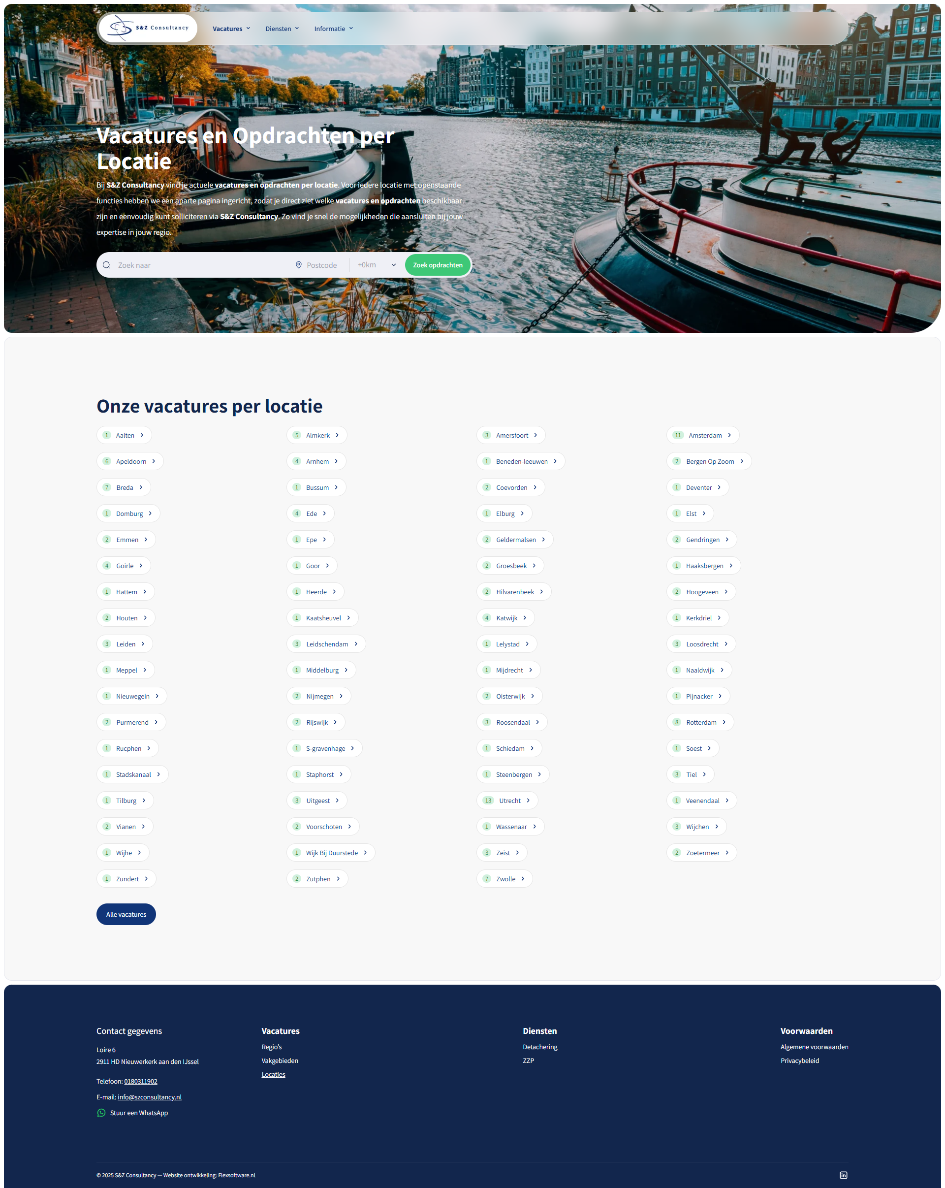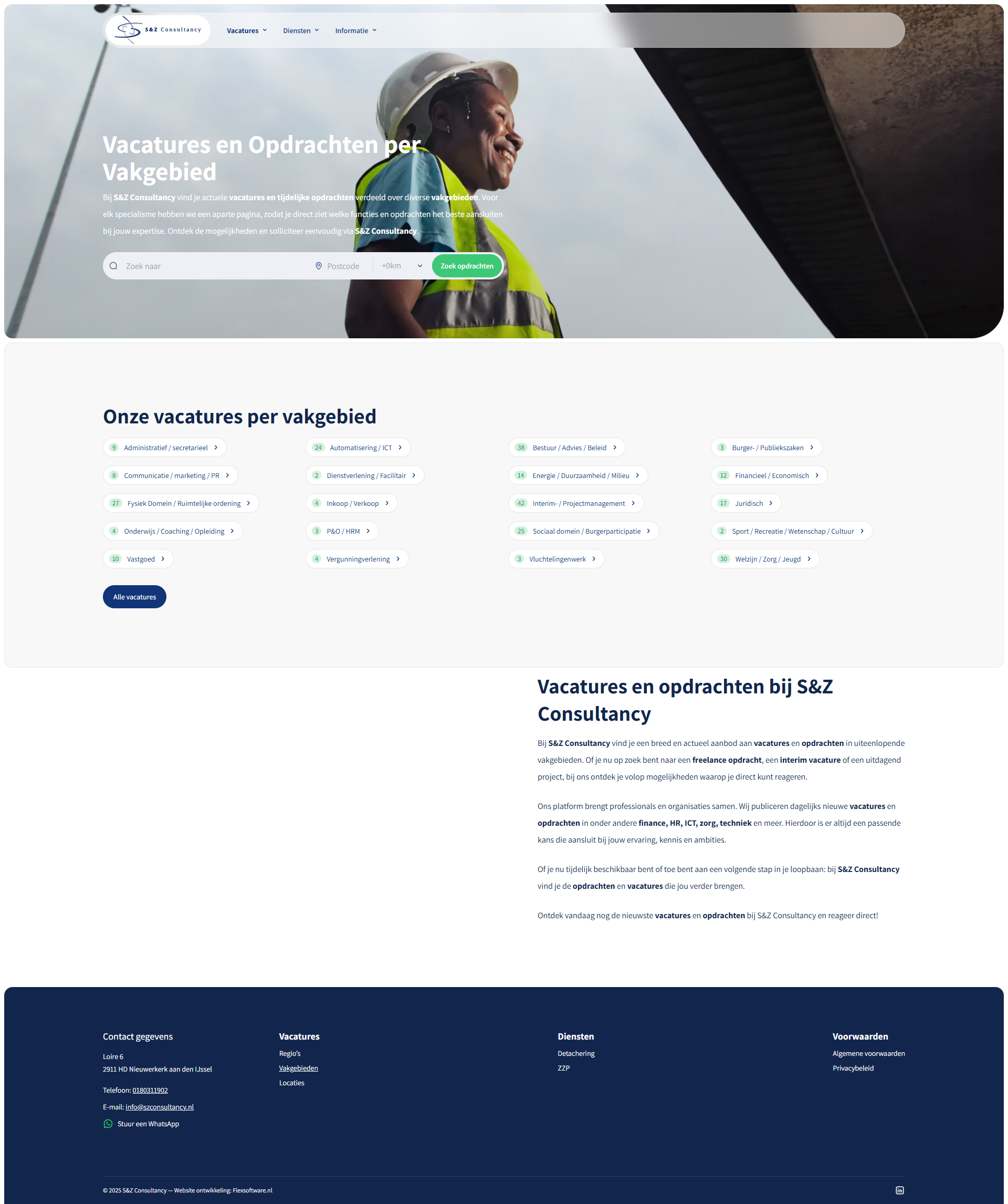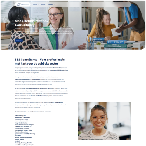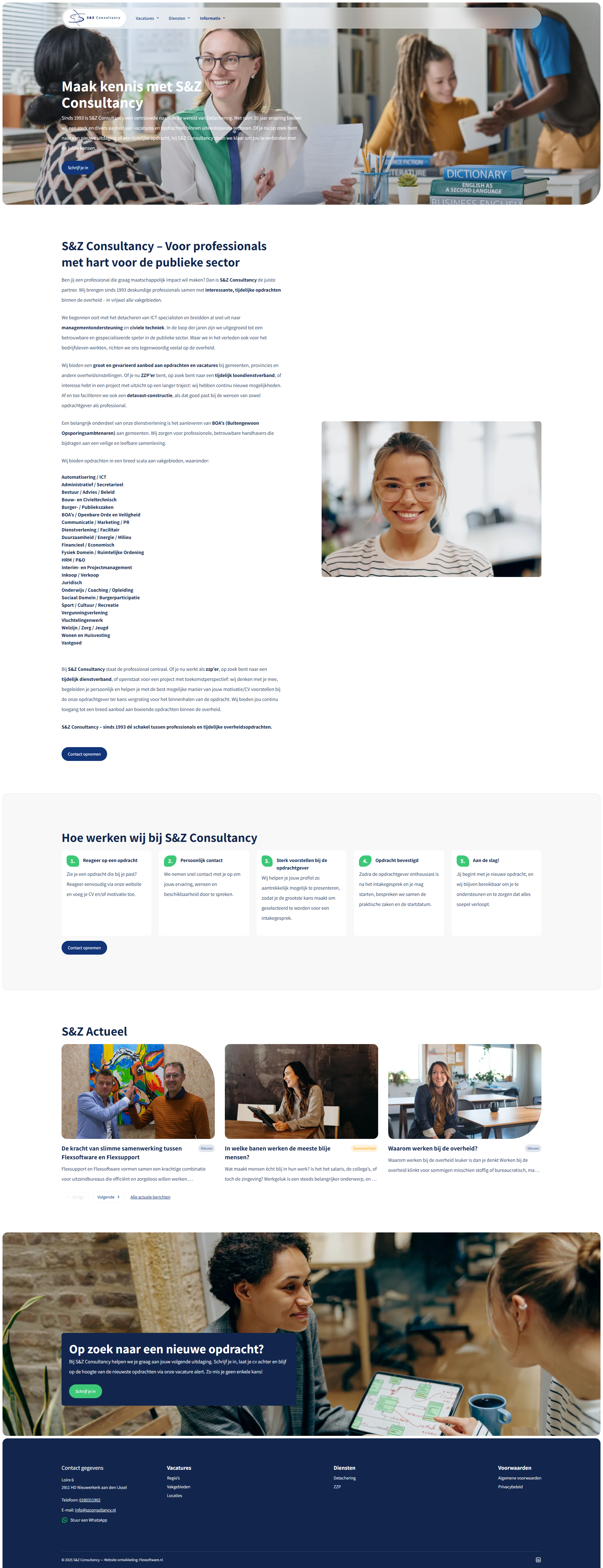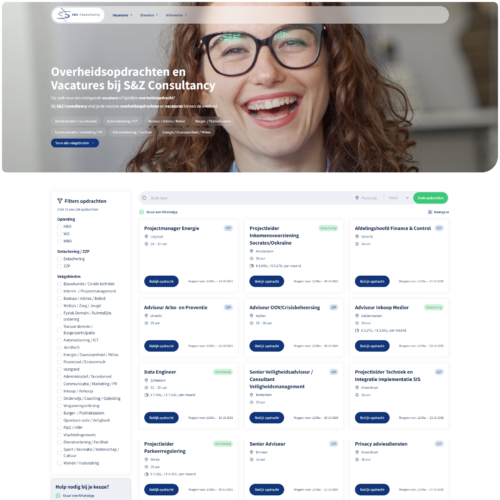 Het team van Flexsoftware heeft een unieke website ontwikkeld voor S&Z Consultancy. Deze organisatie ondersteunt professionals die een hart hebben voor de publieke sector. Maatschappelijke impact staat hierbij centraal. S&Z Consultancy biedt een breed en gevarieerd aanbod aan opdrachten en vacatures bij gemeenten, provincies en andere overheidsinstellingen. Daarbij denken ze persoonlijk met je mee en begeleiden ze je gericht om je kansen op een nieuwe baan te vergroten.
