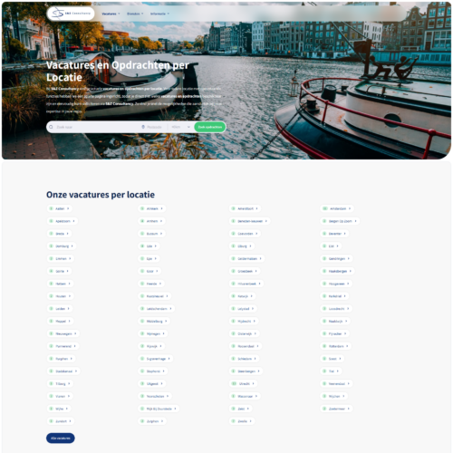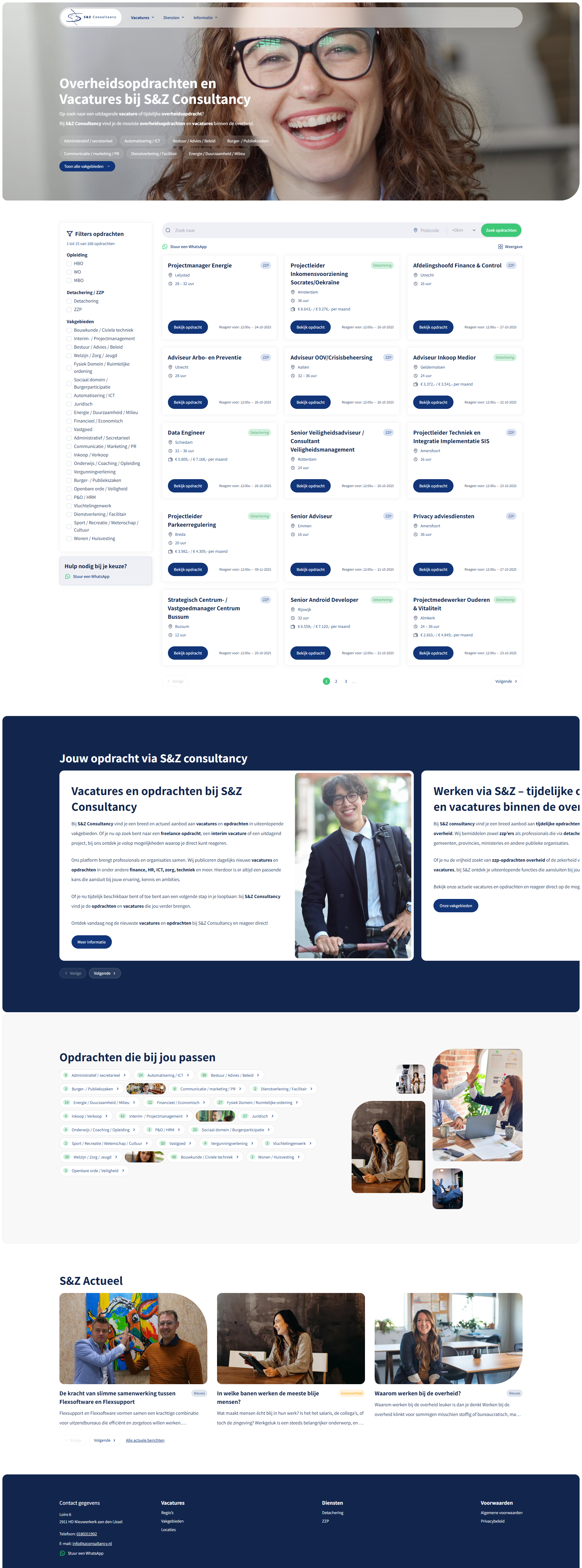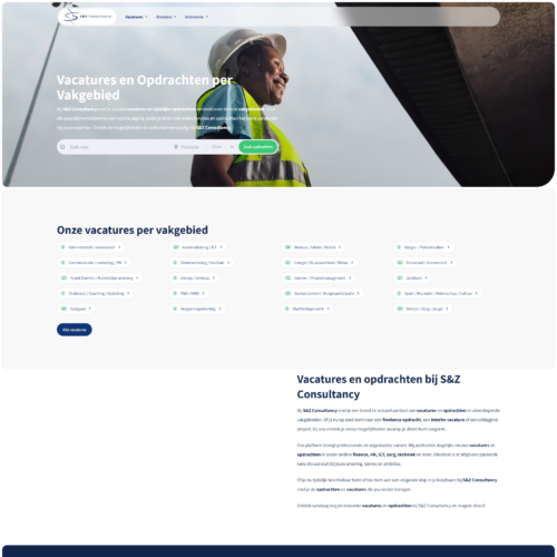 De homepage van de website is uniek en anders dan je gewend bent. In plaats van een aparte landingspagina voor vacatures, staan deze direct op de homepage, waarmee duidelijk wordt dat dit het belangrijkste onderdeel van de site is. S&Z Consultancy wil je dan ook meteen naar deze vacatures leiden. Daarnaast voelt de website persoonlijk aan door het gebruik van bewegende beelden van medewerkers, wat de site levendig en aantrekkelijk maakt. Elke vacature is bovendien voorzien van relevante informatie, zoals locatie, aantal uur, salaris en de uiterlijke reactiedatum.