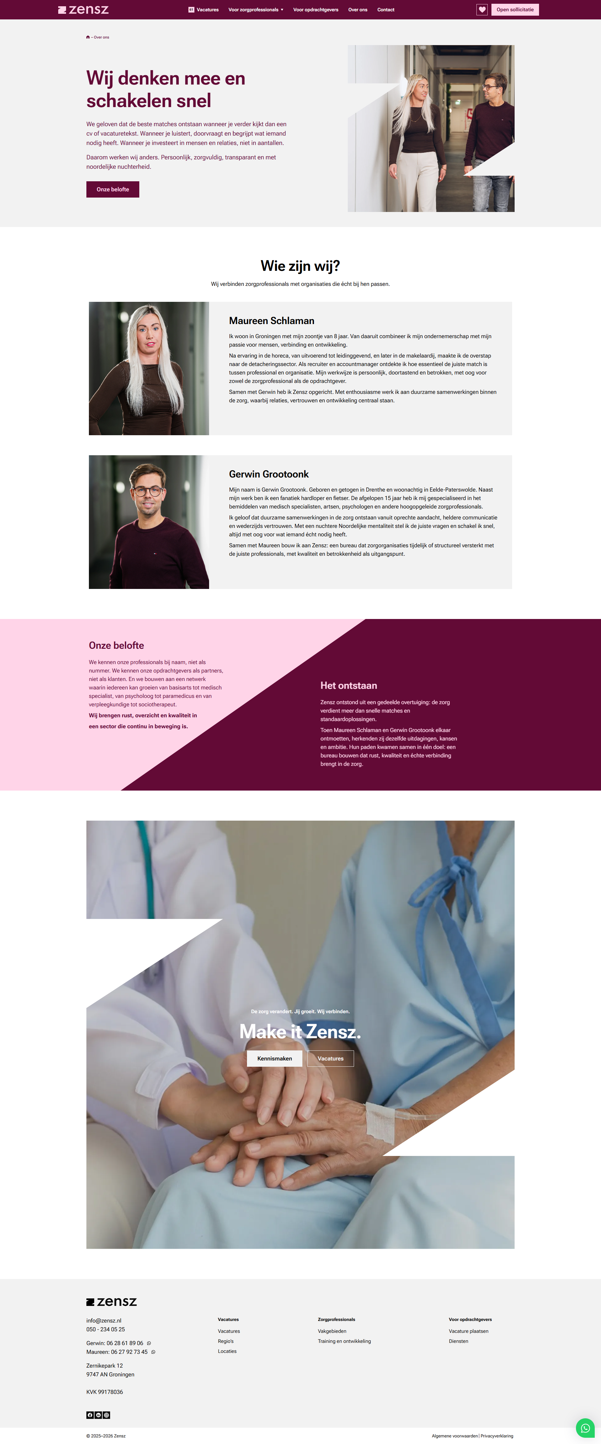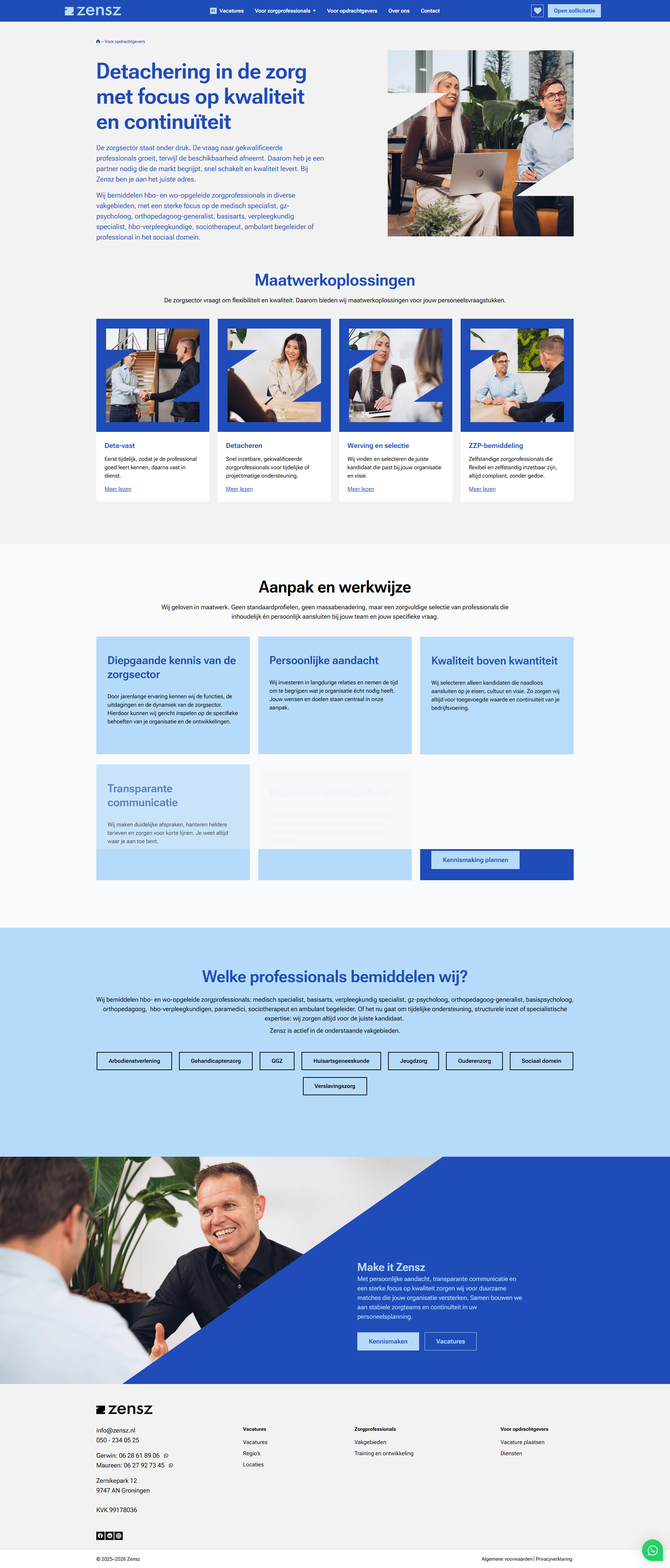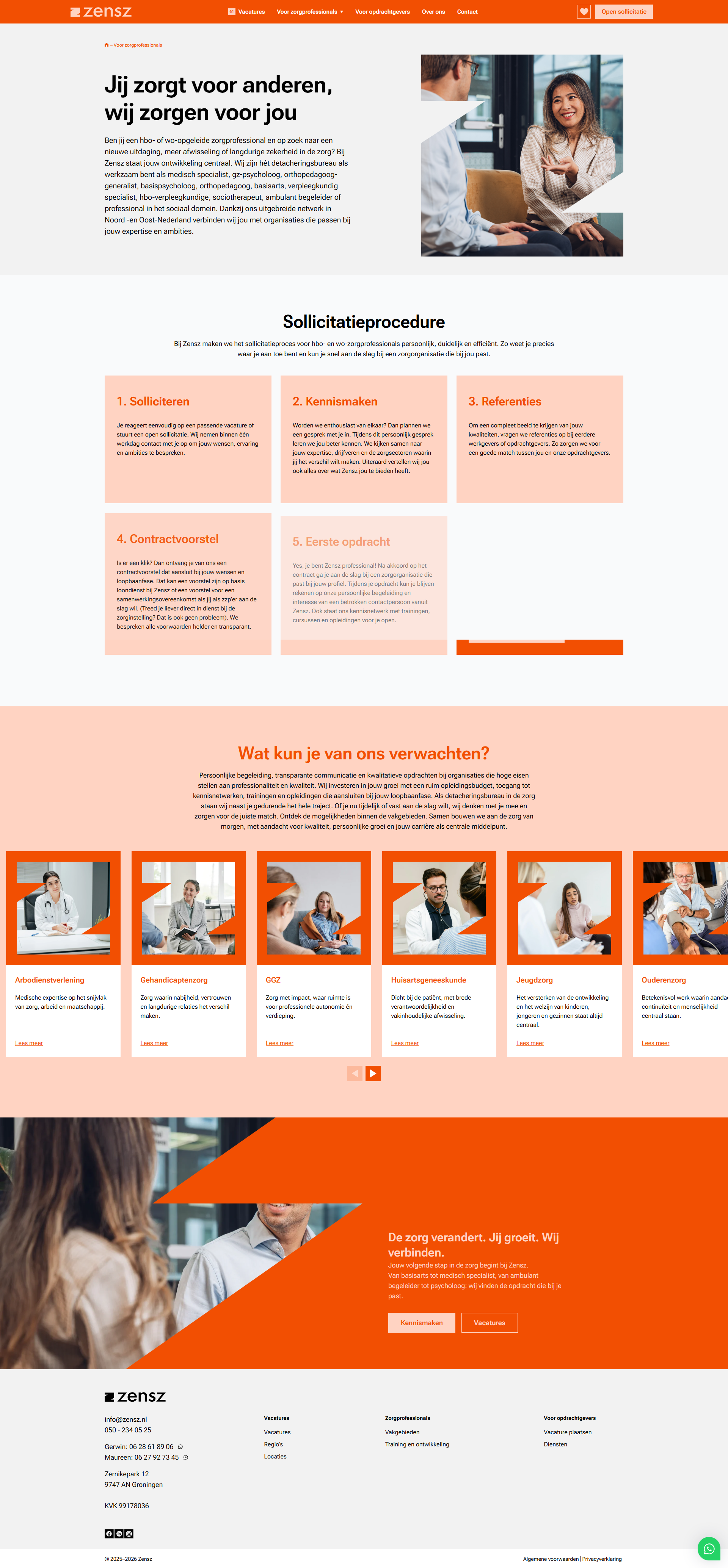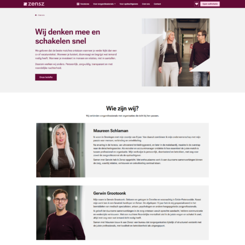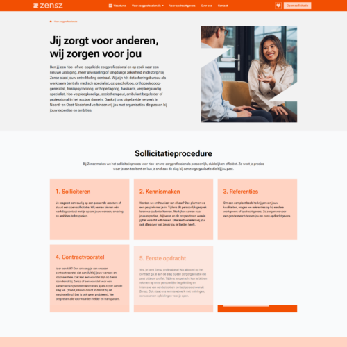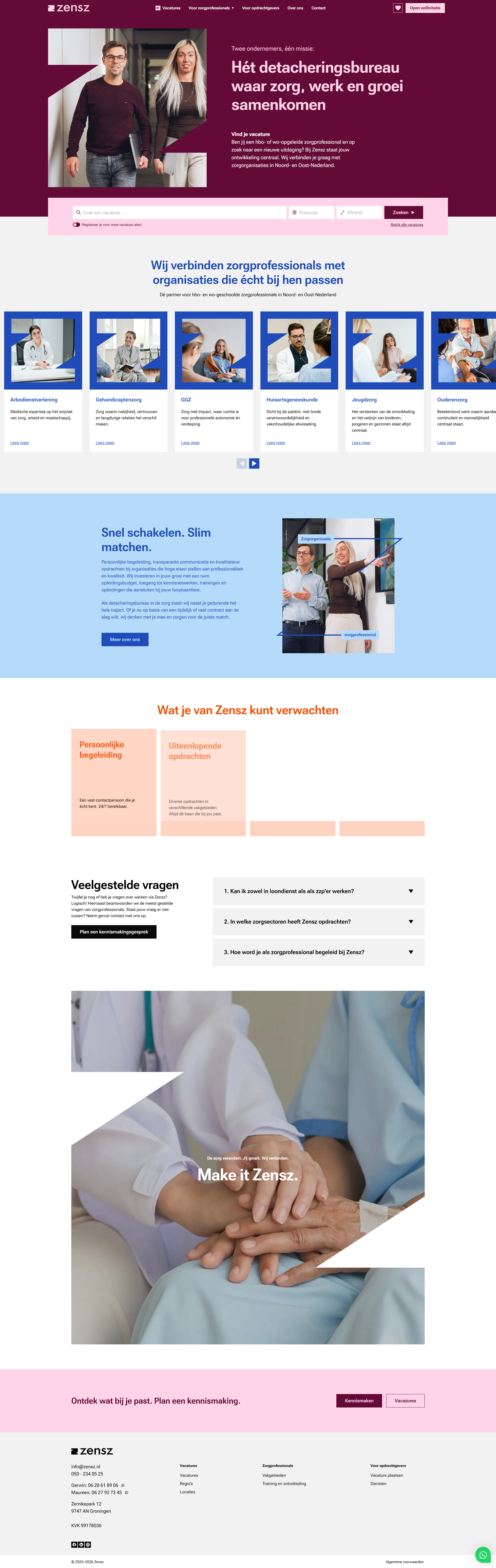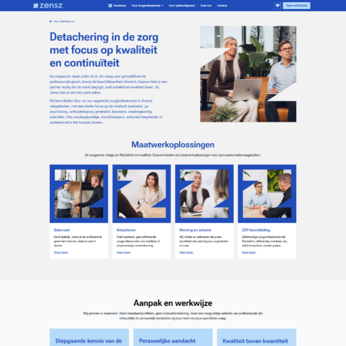 Wij hebben voor Zensz een gloednieuwe website ontwikkeld. Zensz is een detacheringsbureau met een krachtige missie: het verbinden van hbo- en wo-opgeleide zorgprofessionals met organisaties die écht bij hen passen. Bij Zensz draait het niet alleen om de match, maar vooral om de mens achter de professional en hun persoonlijke groei en ontwikkeling.