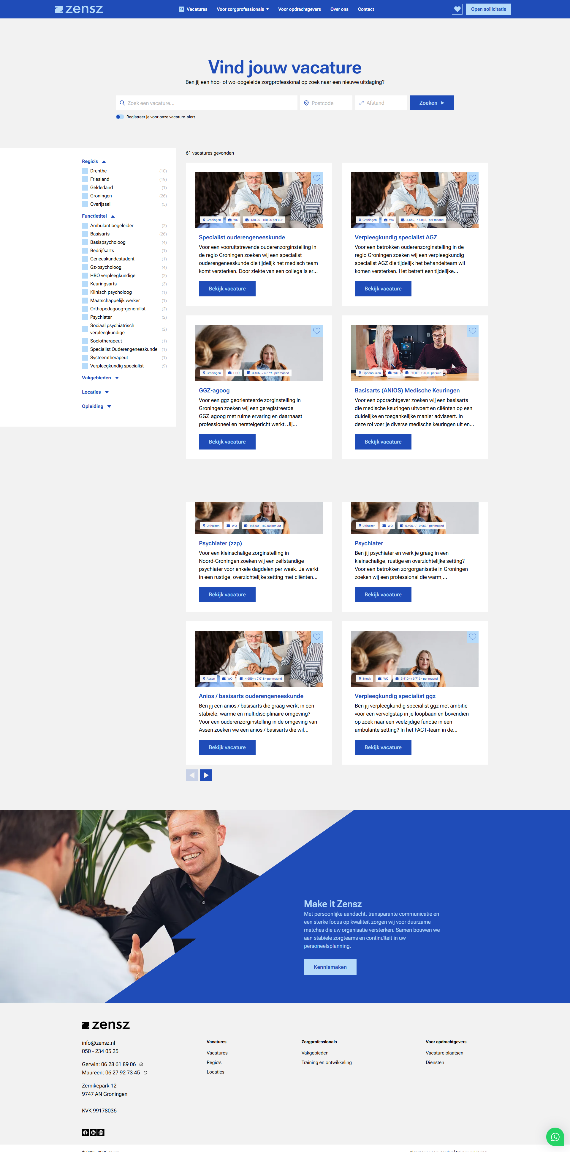 Naast de visuele aantrekkingskracht is de website rijk aan informatieve content. Bezoekers worden uitgebreid geïnformeerd over de verschillende vakgebieden waarin Zensz actief is, van de GGZ tot de ouderenzorg, en wat zij als partner kunnen betekenen. Een slimme toevoeging aan de gebruikerservaring is de nieuwe favorietenfunctie. Hiermee kunnen werkzoekenden eenvoudig interessante vacatures opslaan, zodat zij op een later moment hun ideale vacature kunnen terugvinden en vergelijken.